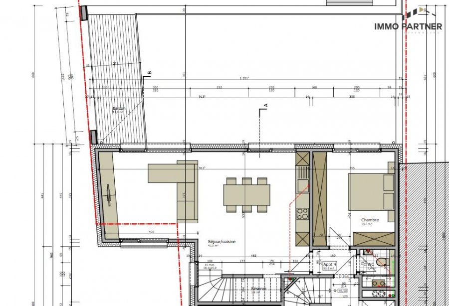 1er étage : Hall d´entrée, W.C. séparé (1,5 m²), living avec cuisine ouverte (41,5 m²), 1 chambre à coucher (14,5 m²), balcon (12 m²) orienté plein sud.