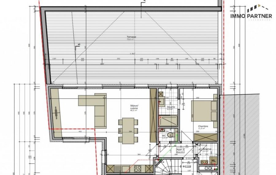 Hall d'entrée, débarras (2,4 m²), W.C. séparé (1,5 m²), living avec cuisine ouverte (40,5 m²), 1 chambre à coucher (11,9 m²), salle de douche (4,4 m²), grande terrasse ensoleillée (73 m2).